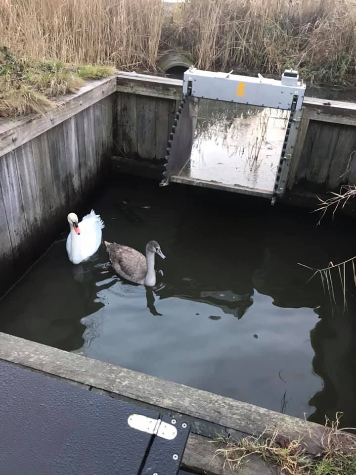 Gisteravond ging kj nog even een rondje kievietslanden terwijl ik lekker op de bank bleef #migraine helaas. Uurtje later belt KJ dat er zwanen vast zitten en er niet uit kunnen. Ik snap er niks van maar verman me, trek schoenen aan en ga gewapend met stanleymes en dekentje richting KJ. Ik denk ze zitten vast aan een hek of een touw of zo..., maar ze zitten vast in de sluis. Het is een kleine overloop sluis van hooguit 5m2 waar ze dus nooit een opstart kunnen maken. We staren en puzzelen en gaan dan eerst Martijn bellen. Die weet nog wel ergens een plank te liggen. Die gaan we halen maar die is te kort. We halen een andere, beetje langer. Ondertussen schemert het al. Zwaan snapt wel dat ie de plank op moet lopen maar de plank is te smal, 1 poot er op en 1 poot ernaast, dat schiet niet op. We halen de plank weg en laten ze vannacht met rust. De volgende ochtend ga ik toch maar even kijken. Ze zitten er nog. Ik bel de jachtopziener (ik heb heel nieuwe telefoonnummers in mijn contacten!!) maar die zegt dat als hij komt, het met de zwaan waarschijnlijk afgelopen is en dat ik beter de dierenambulance kan bellen. Die komen al na een half uurtje (ben thuis wezen opwarmen...) maar weten zich geen raad. Eentje trekt nog heldhaftig een pak aan maar daar krijgt hij geen extra moed van om het water in te gaan . De ander staat erbij en kijkt ernaar en belt eens wat. KJ belt wat de status is, inmiddels is er ook iemand van Natuurmonumenten bij. KJ komt ook en neemt een ladder mee. Daar scheppen we redelijk makkelijk de ouder zwaan mee het water uit. Die snapt dat je op de ladder moet zitten waarna wij de ladder omhoog tillen zodat ze eraf kan stappen. Hij (of zij) blijft vlakbij staan en geeft zichzelf eerst een poetsbeurt maar het jong zit er nog. Die wordt heel onrustig. Trap werkt niet, we hebben nog een groot net maar daar raakt ie eerder in verstikt dan mee gered, wordt em ook niet. Toch maar brandweer bellen. Helaas heb ik geen tijd meer want we hebben een stapel online bestellingen in de Book-Inn die weggewerkt moeten worden. Heerlijk!!! NM en ik vertrekken en laten de mannen en zwanen achter. KJ moet ook weer aan t werk maar ziet na een uurtje of zo de brandweer voorbij rijden. Als we s avonds een rondje doen in het donker, is de sluis iig leeg. Jammer dat we het spektakel niet helemaal hebben gezien, maar we hebben weer een avontuur en dat is ook leuk.